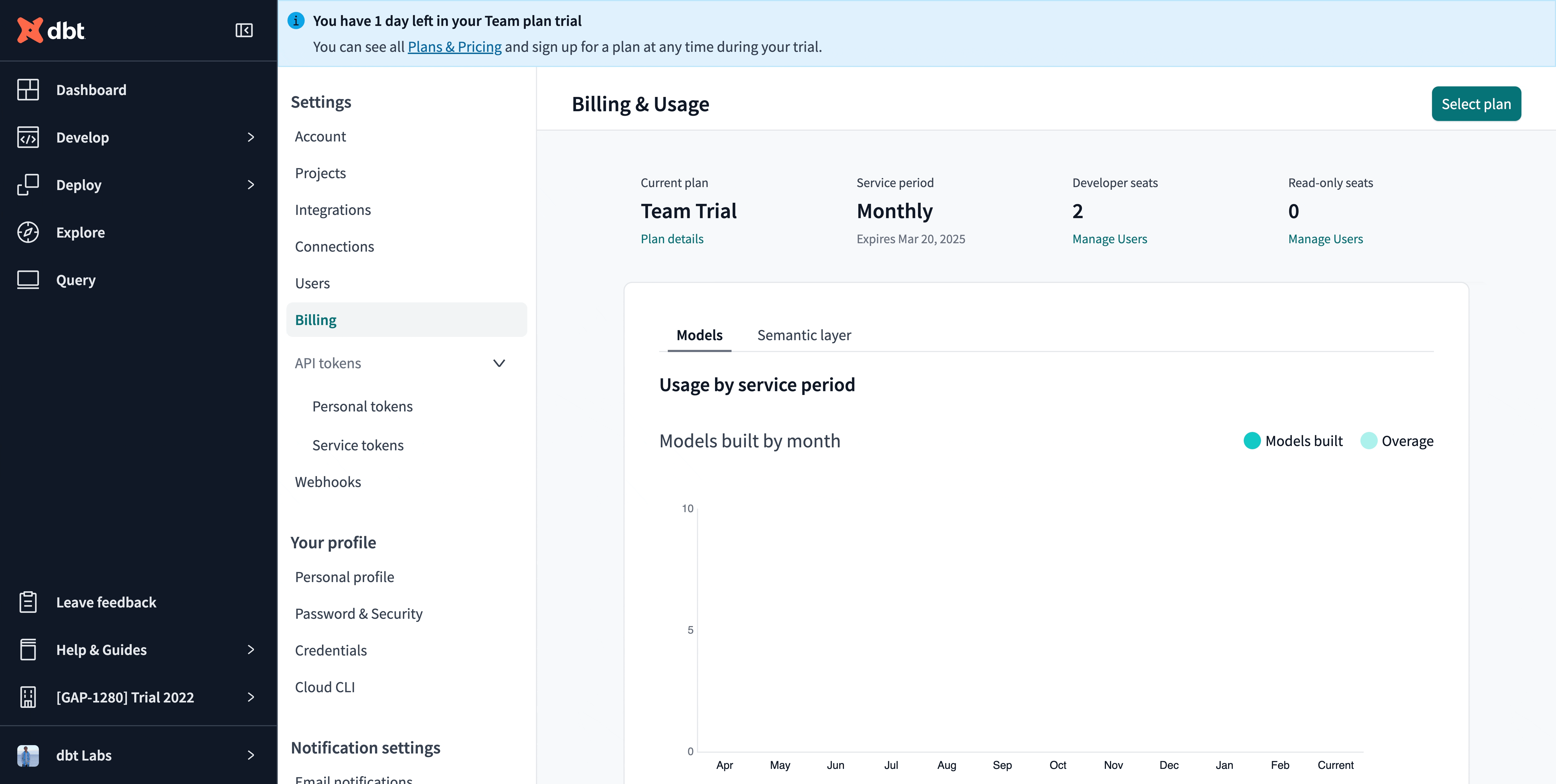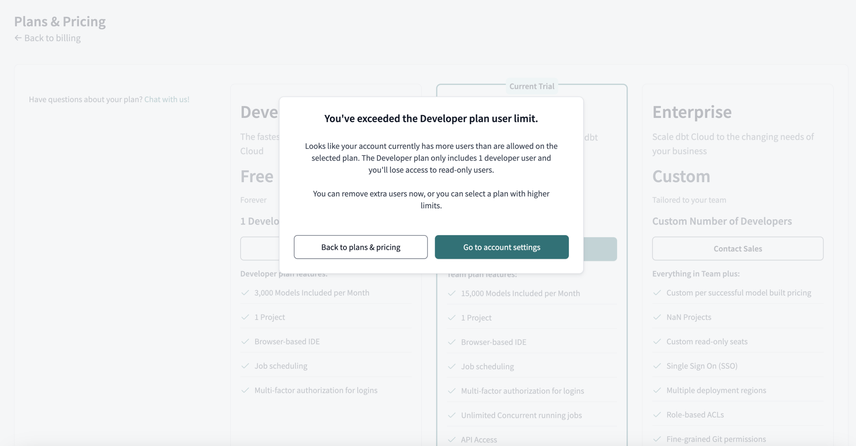 • Under Billing, you can review the available dbt plans and their features